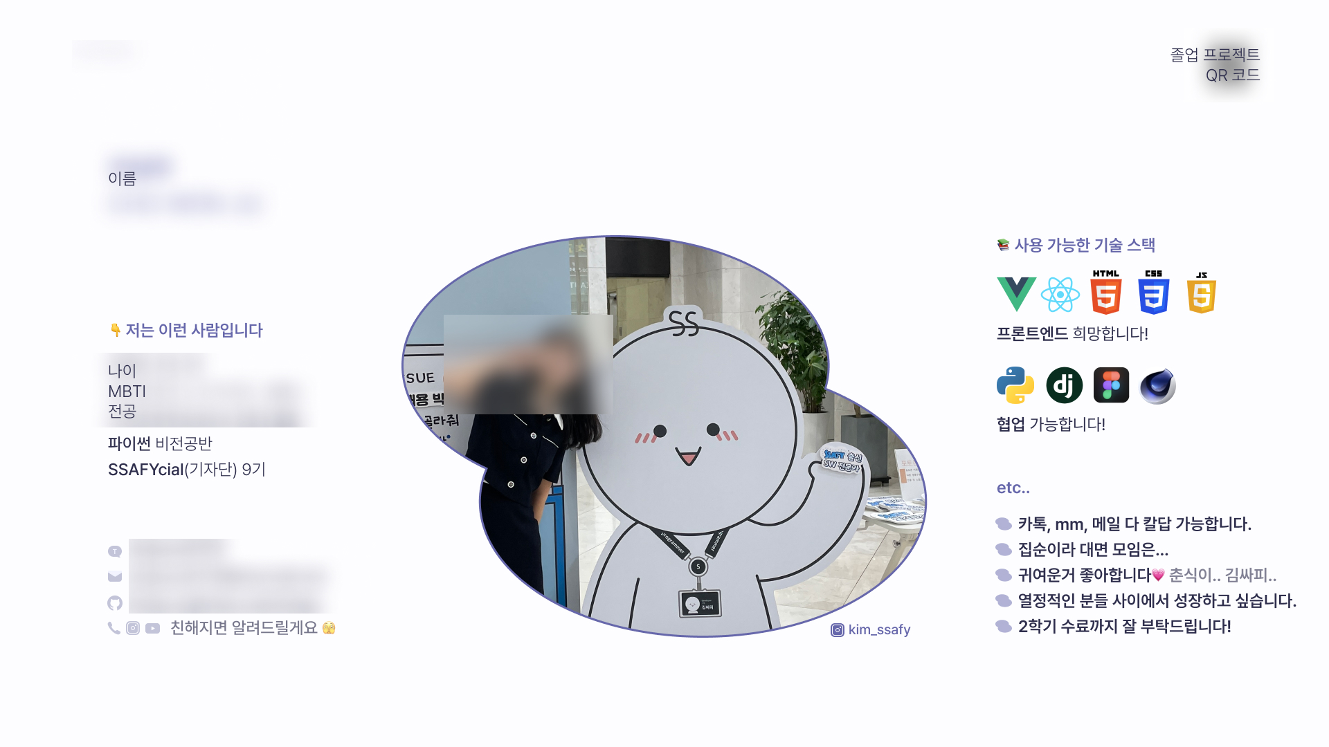 첫 프로젝트 팀 구성이 임베디드 3, 백엔드 1, 프론트엔드 1, 풀스택 1 이어서 5주동안 모든 페이지를 혼자 구현 & 스타일링 하느라 정말 바빴다. 그렇지만 덕분에 단기간에 정말 많은 성장을 할 수 있었다. 교육장과 집의 경계가 없을만큼, 팀원에게 경고를 받을만큼 열심히 했다.ㅎㅎ