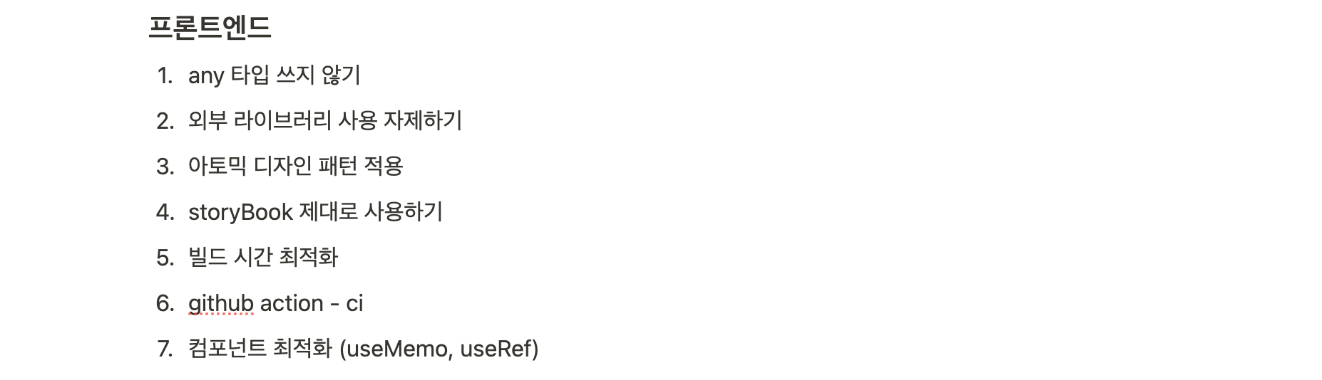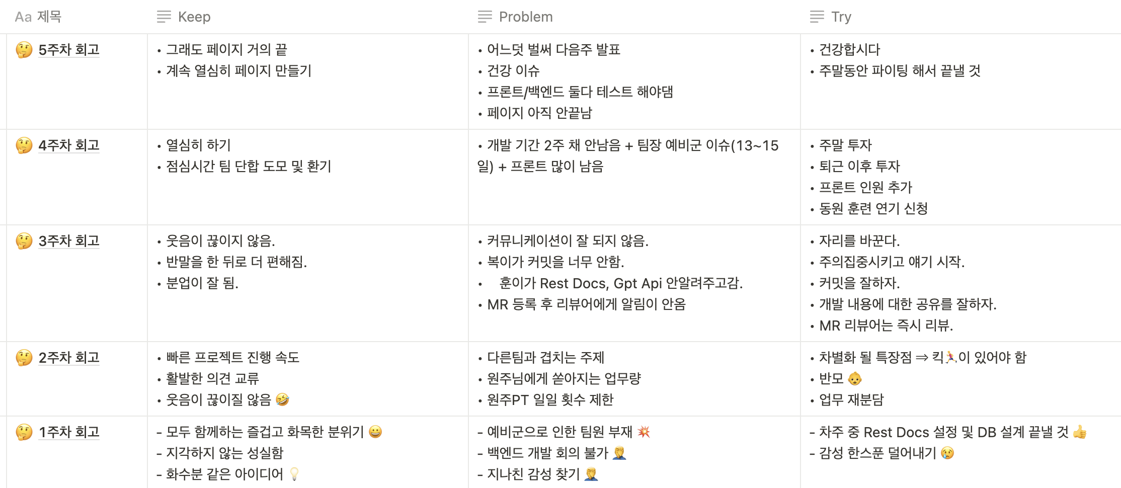 그리고 회고를 매주 금요일에 진행했는데, 약간 의무이기도 했지만 많은 도움이 됐다. 진행 상황도 체크하고 개선할 부분도 스스럼 없이 이야기할 수 있어서 팀 발전에 좋은 영향을 줬다. 비슷한 맥락에서 프론트엔드 팀원이 3명이나 되니까 코드리뷰를 진행할 수 있었다.