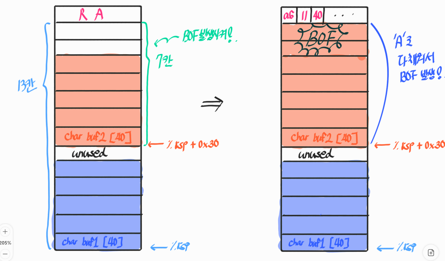 buf2가 저장되는 공간부터 return address까지는 총 7칸이므로