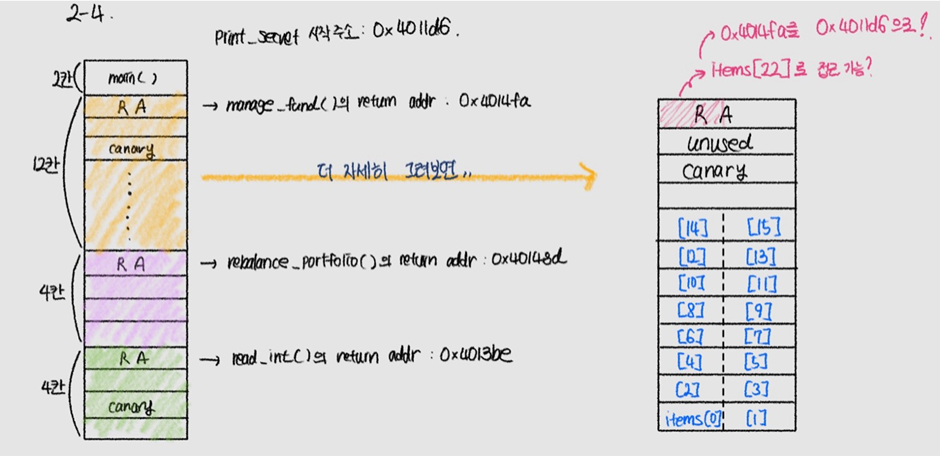 그럼 배열 items가 정의되어 있는 manage_fund()함수의 return address을 알아내보자!