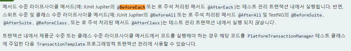 정확히 나와 있습니다... @BeforeAll은 테스트 관리 트랜잭션 내에서 실행 되지 않는다고 합니다.