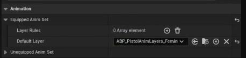 B_WeaponInstance_Pistol를 장착하면 ABP_PistolAnimLayers_Feminine이 장착될 것