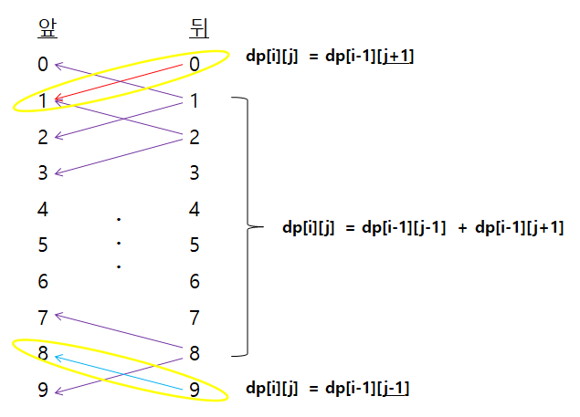 dp[N의 수][N 자리 숫자일 때 해당 숫자 앞에 올 수 있는 일의 자리 수]