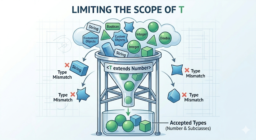 한정된 타입 매개변수는 제네릭을 정의할 때, 아무 타입이나 다 받는 것이 아니라 특정 범위의 타입만 허용하고 싶을 때 사용한다.