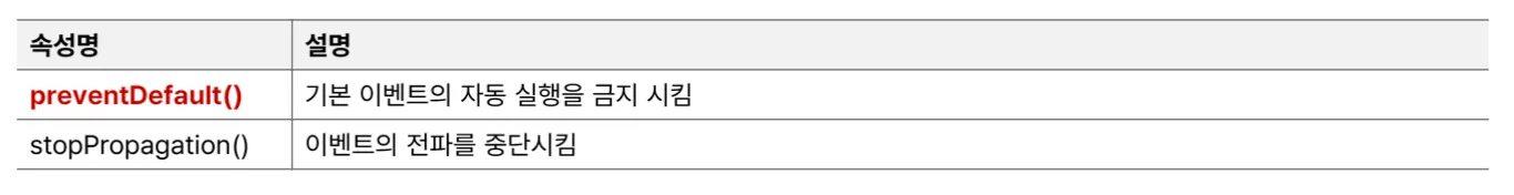 <a>, 브라우저 화면에서 마우스 오른쪽 클릭 → 컨텍스트 메뉴 출력, <form> 요소 내부의 submit 버튼 클릭 → 서버로 전송event.preventDefault()수식어를 통한 기본 이벤트 차단