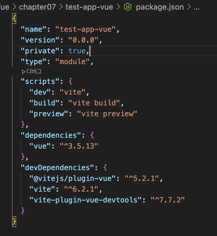 "type": "module" ES 모듈"build": "vite build" (펙킹, 번들링) 배포본 제작"dev": "vite" 평상시에는 develop으로"dependencies" 실제 배포용에서 필요“devDependencies” 배포할때는 필요없다(개발 과정에서만 필요)