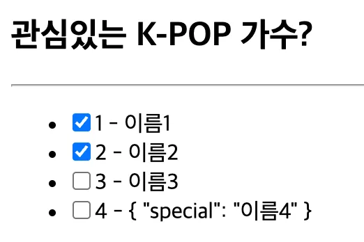 <!-- name, checked 속성 대신에 idol 이라는 속성을 전달받도록 변경 -> 속성으로 객체를 전달받을 것 -->