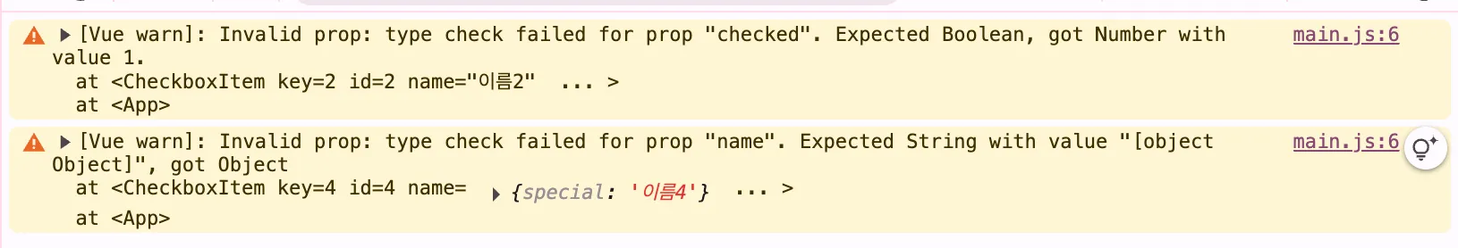 이 에러는 부모 컴포넌트에서 자식 컴포넌트(CheckboxItem.vue)로 전달하는 props 타입이 올바르지 않아서 발생한 것이다.
