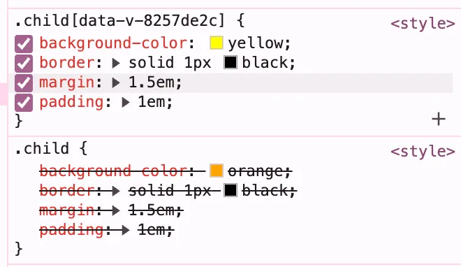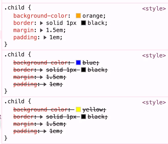 취소선 → 같은 child css가 계속 들어와서 전부 무시 → 마지막꺼만 살아남음