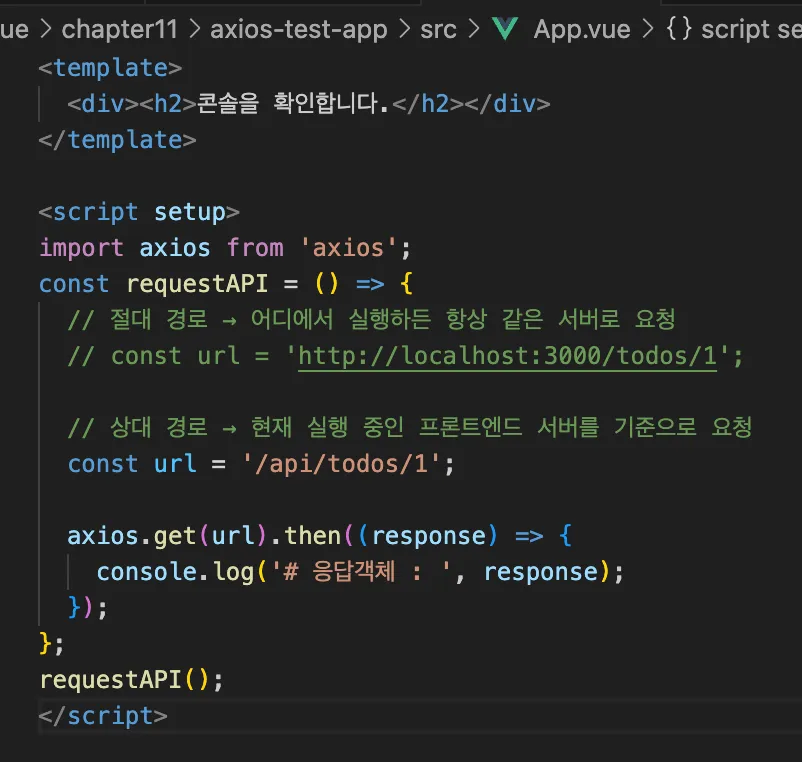App.vue(App.vue를 axios를 이용해 /api/todos/1를 요청하고, 그 결과를 콘솔에 출력)