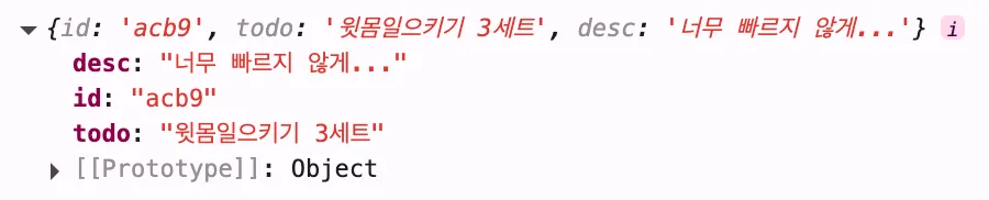 let data = { todo: '윗몸일으키기 3세트', desc: '너무 빠르지 않게...' };
