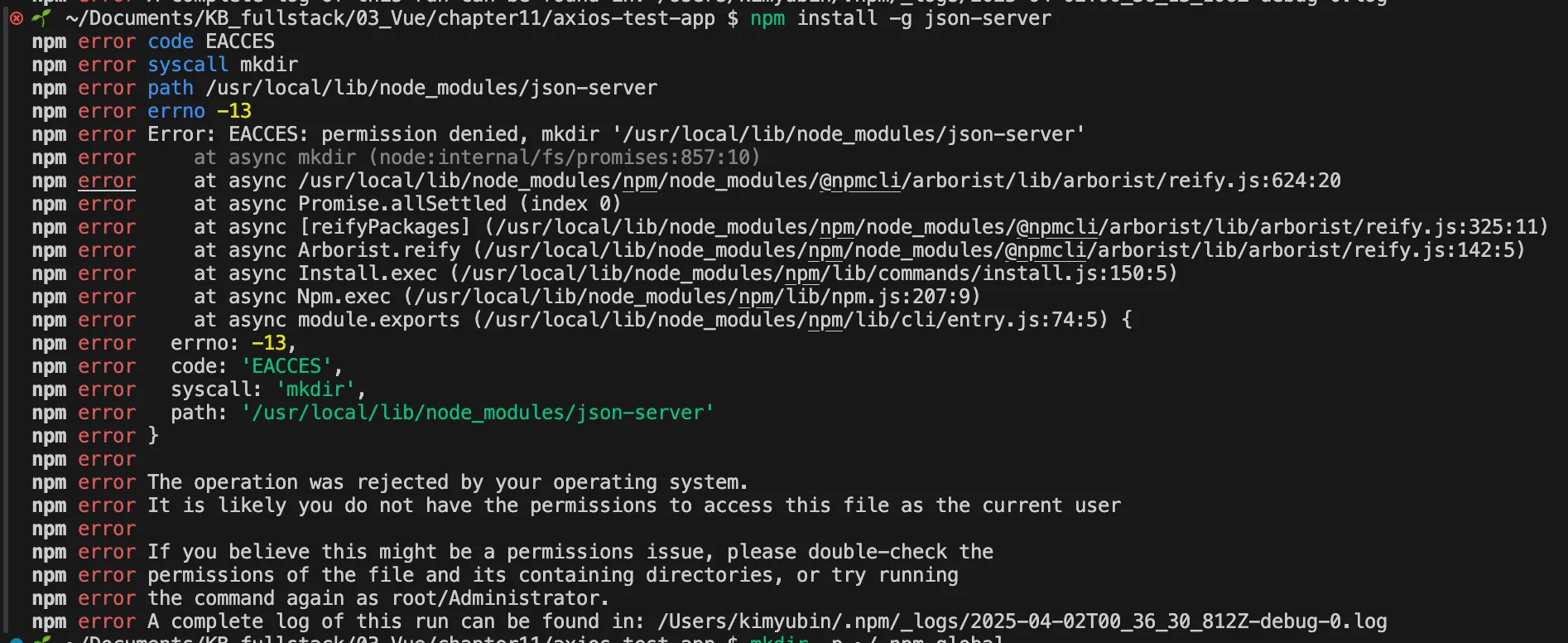 sudo사용 (하지만 비추천)sudo npm install -g json-server👉 이 방법은 권장되지 않음! (관리자 권한을 자주 요구하게 되고, 파일 소유권 문제를 유발할 수 있음)