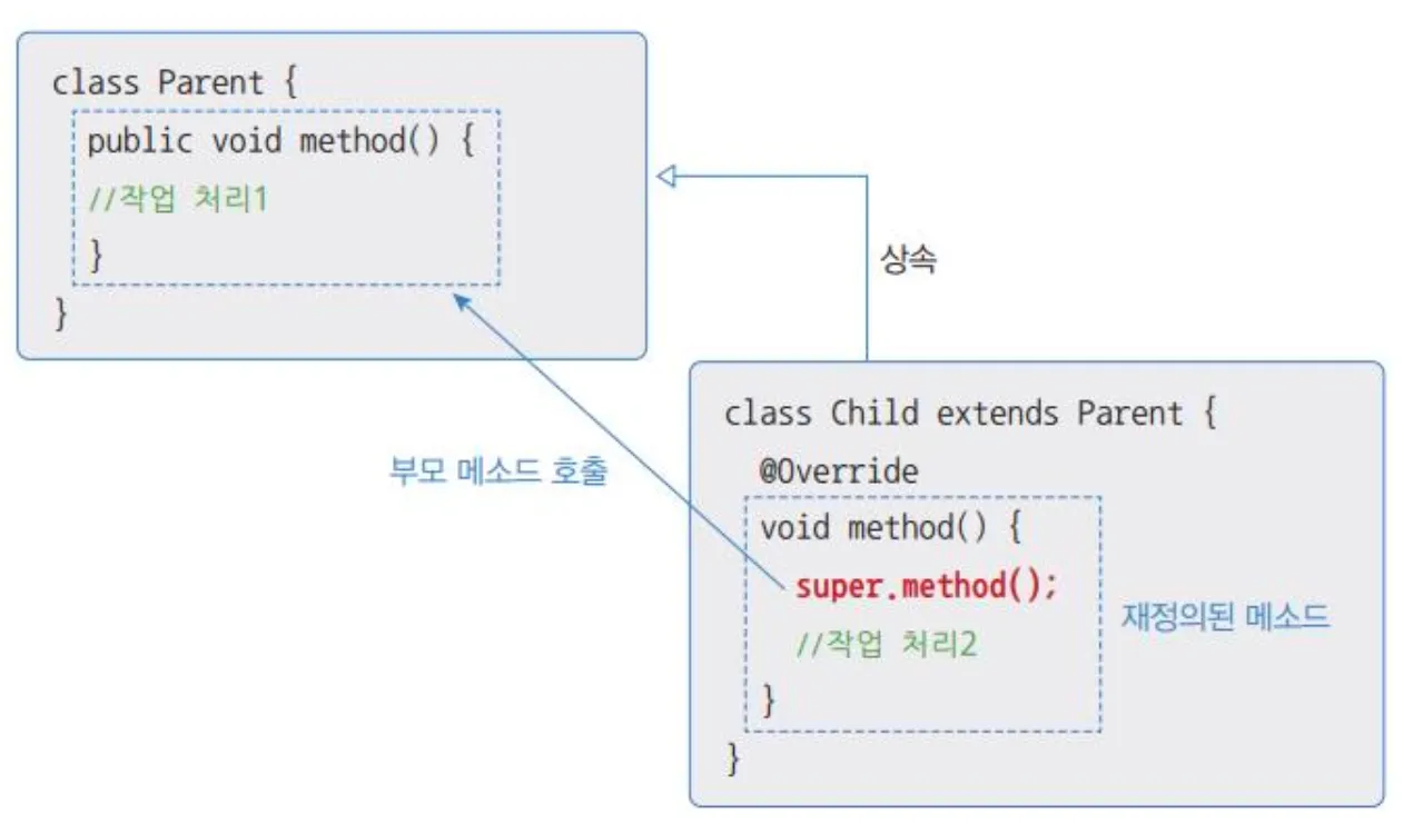 super().메소드() : 자식 메소드 안에서 부모의 메소드를 명시적으로 호출하는 방법