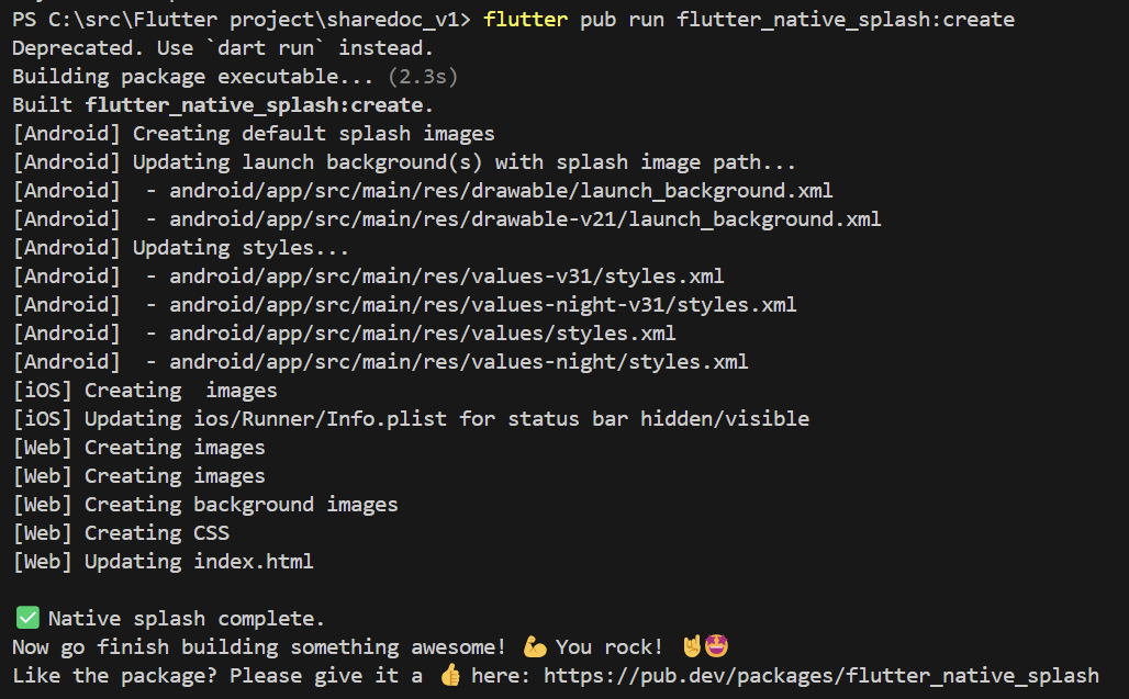 $ flutter pub run flutter_native_splash:create --path=./flutter_native_splash.yaml