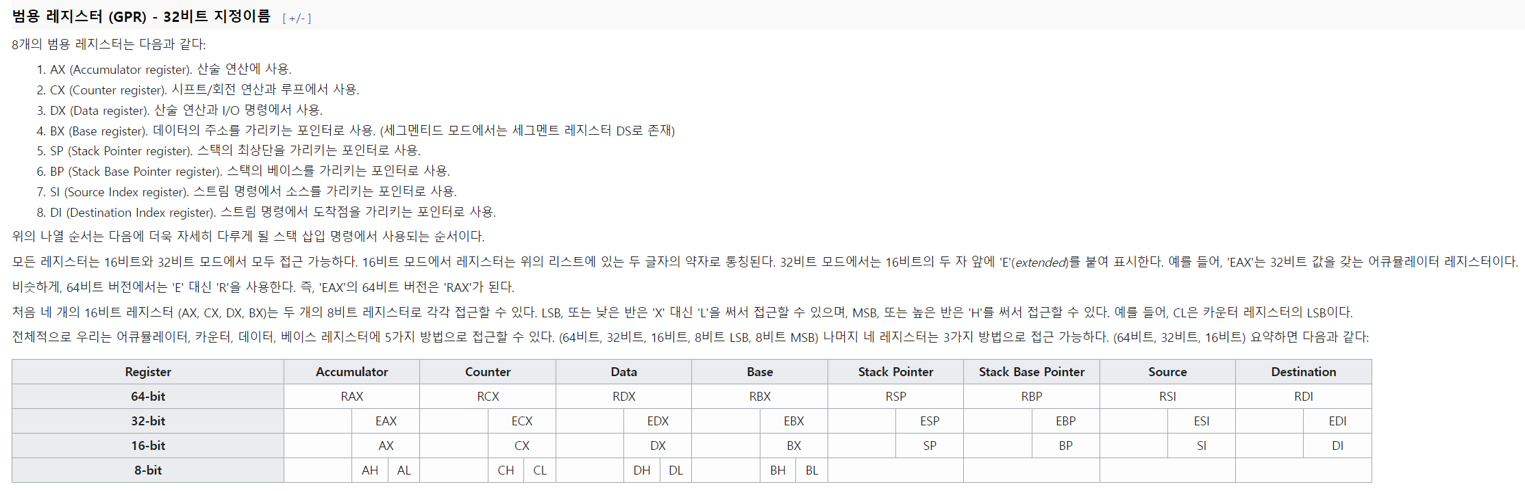 상기 x86 register set의 설명 이미지는 위키피디아를 참고했습니다.