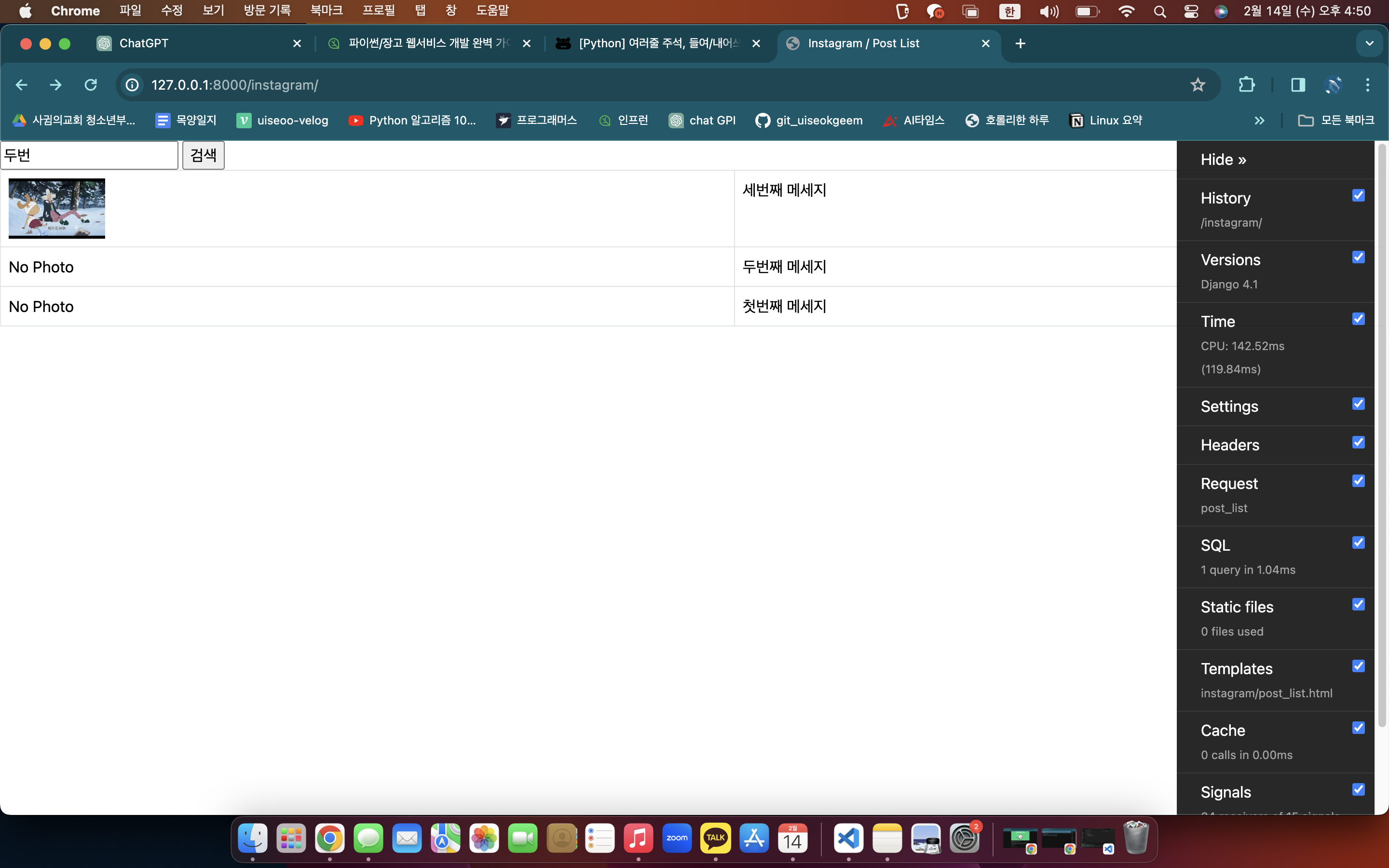- 라우팅에 의해 GET 요청값을 Instagram view.py의 post_list 함수에 전달 및 q에 대한 처리
