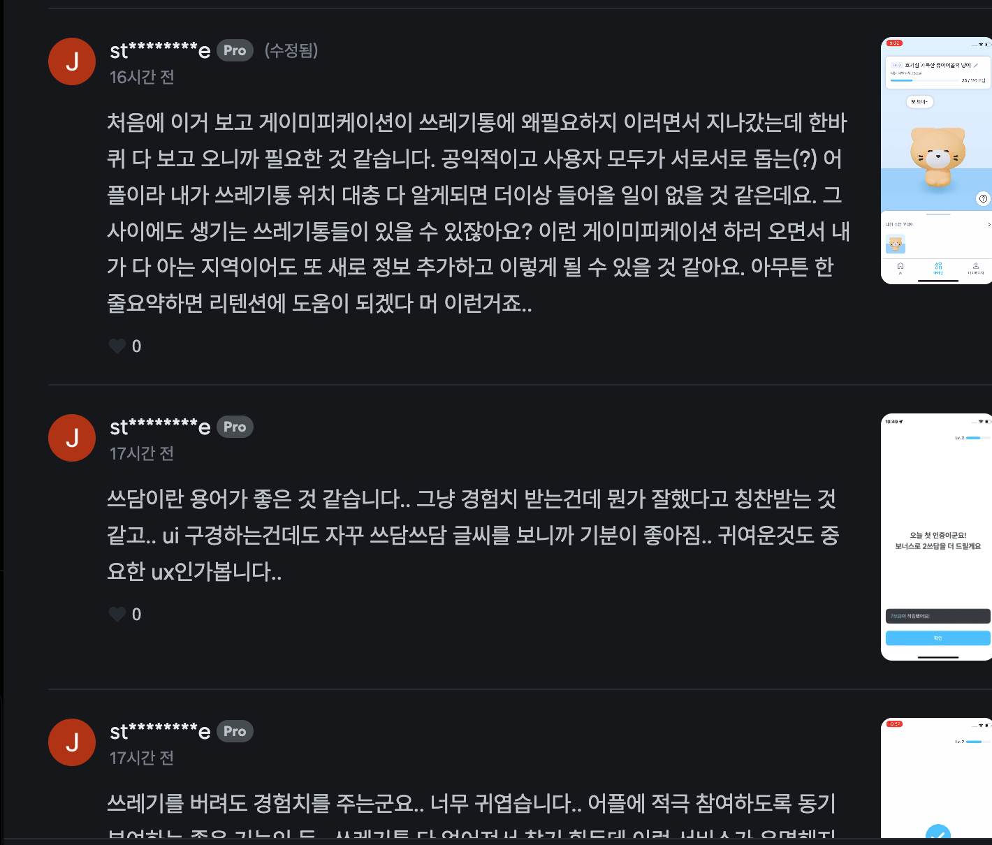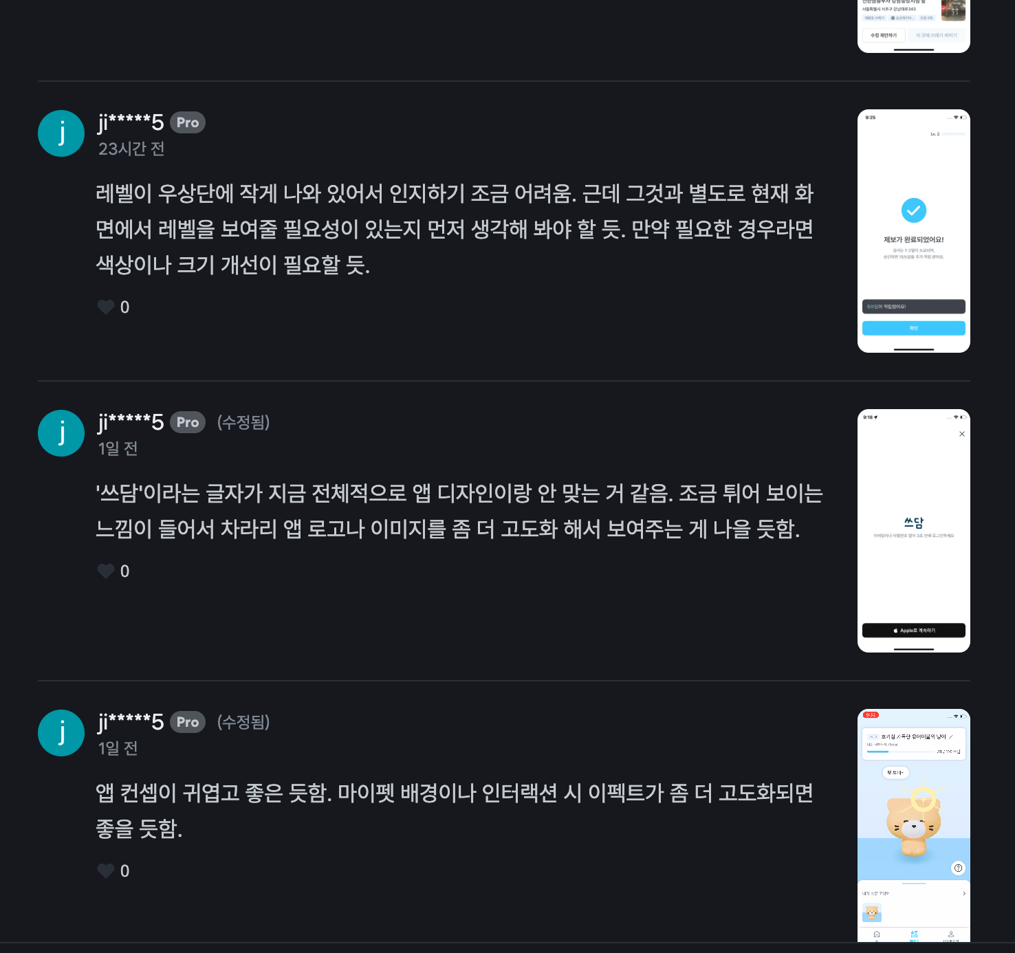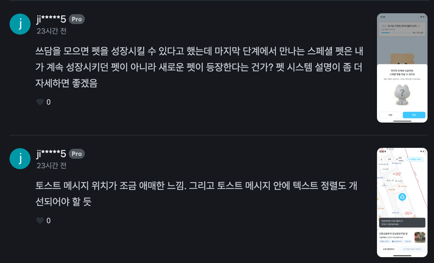 마냥 좋은 피드백만 받은 것은 아니였어요, 서비스에 대한 긍정적인 피드백뿐만 아니라 어떠한 개선점이 있으면 좋을 지 uibowl 대시보드에서 피드백을 공유받을 수 있었습니다!