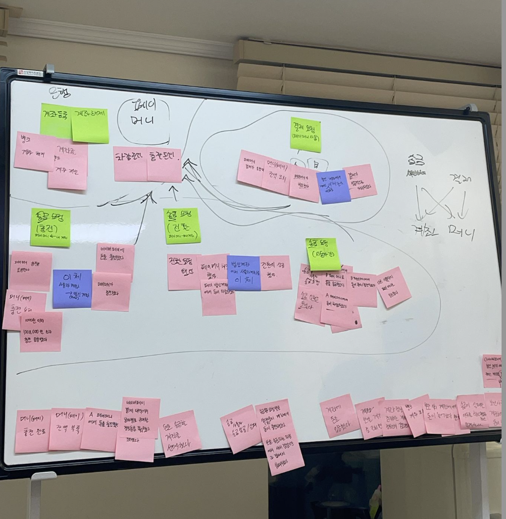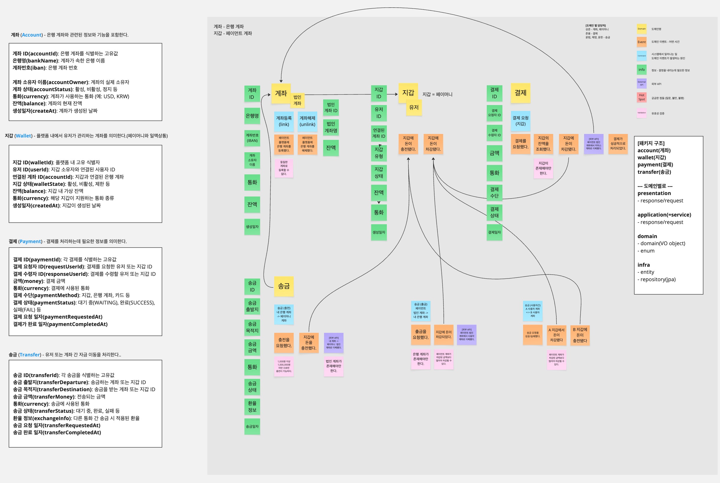 핀테크 도메인에 적합한 요구사항을 컴팩트하게 정의하였고, 이후 모델링하여 설계할 수 있도록 포스트잇을 활용해 이벤트 스토밍을 진행하였습니다.