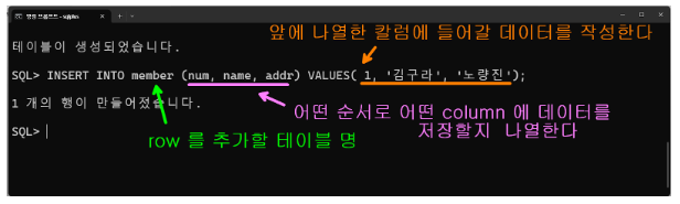 테이블명 괄호에 나열한 컬럼 순서대로 데이터를 넣을 수 있다.