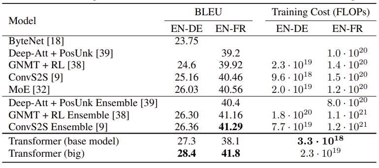 โ WMT 2014 ์์ด-๋ ์ผ์ด ๋ฒ์ญ ์์ ์์, ํฐ Transformer ๋ชจ๋ธ์ BLEU ์ ์ 28.4๋ก ์ด์ ์ต๊ณ ๋ชจ๋ธ๋ค์ 2.0 BLEU ์ด์ ์ด๊ณผํ์ฌ ์๋ก์ด ์ต๊ณ ๊ธฐ๋ก์ ์ธ์.