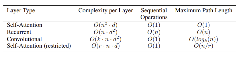 โ Self attention ์ธต์ ์ผ๋ฐ์ ์ธ ์ํ ๋ฐ ํฉ์ฑ๊ณฑ ์ธต๊ณผ ๋น๊ตํ์ฌ ์ฌ๋ฌ ๊ฐ์ง ์ธก๋ฉด์ ํ๊ฐํจ.