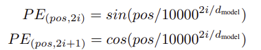 => ์๋ฒ ๋ฉ๊ณผ ๋์ผํ ์ฐจ์ dmodel์ ๊ฐ์ง๋ฉฐ, ๋ค์ํ ์ฃผํ์์ ์ฌ์ธ ๋ฐ ์ฝ์ฌ์ธ ํจ์๋ก ๊ตฌ์ฑ๋จ