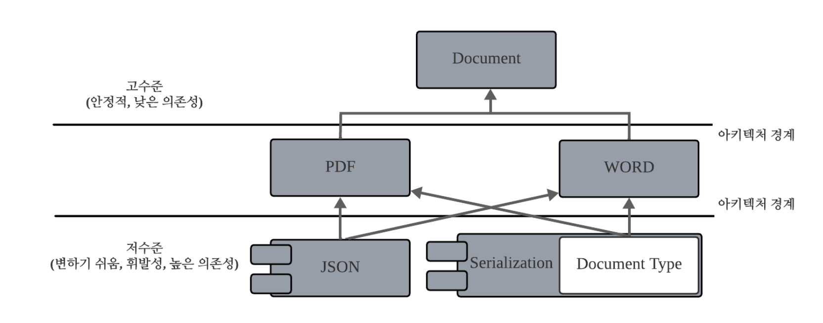 이 접근법은 직렬화에 매우 일반적이다. 하지만 이 저수준 문서 표현을 Document 클래스 구현 내에서 사용하면 실수로 서로 다른 모든 종류의 문서를 결합할 수 있다. 모든 파생 클래스는 다른 모든 Document 타입에 관해 암시적으로 알 고 있으며, 결과적으로 새로운 문서 종률르 추가하면 모든 기존 문서 유형에 직접 영향을 미친다.