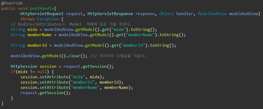 - postHandle : 컨트롤러가 요청을 처리한 후 뷰가 렌더링되기 전에 호출