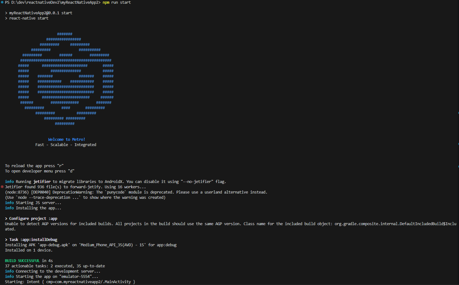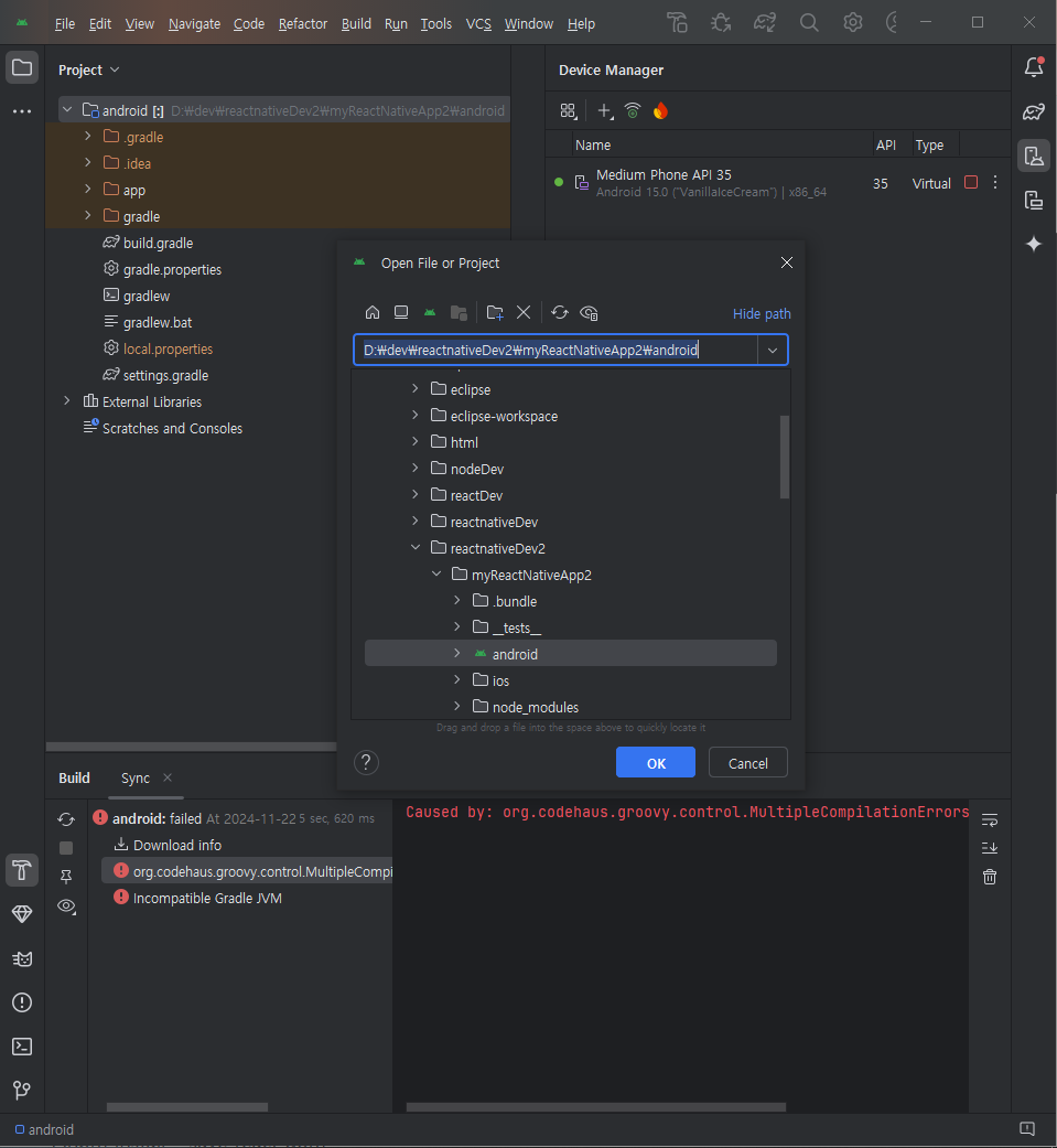 5.npx react-native init myReactNativeApp --version 0.68.2(14버전 이상) (12버젼은 0.66.4) (프로젝트 생성)