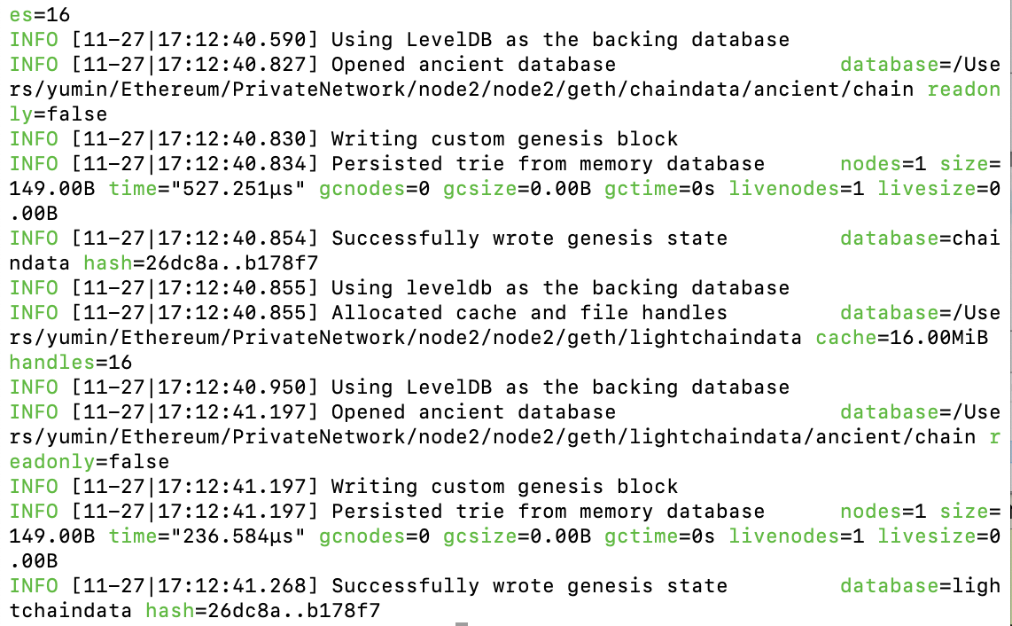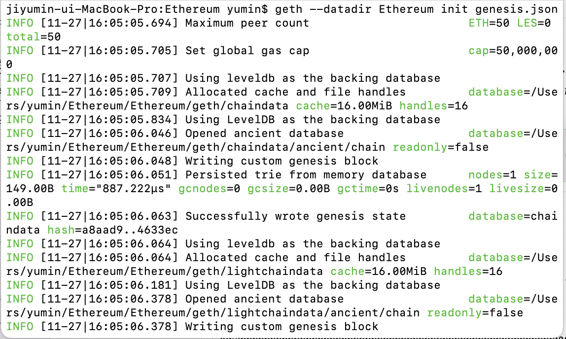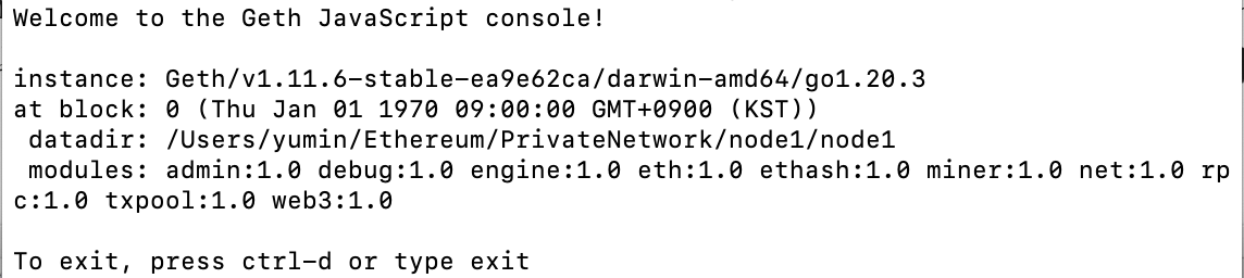 $ geth --datadir node1 init genesis.json