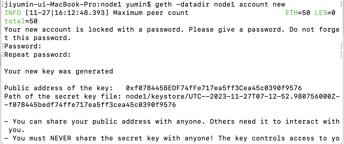 $ geth -datadir node1 account new