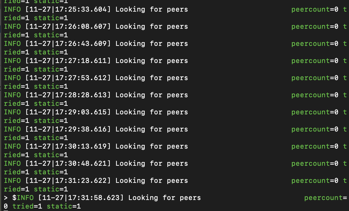 $ geth --datadir node1 --networkid 10 --allow-insecure-unlock --http --http.port 8545 --http.addr "0.0.0.0" --http.corsdomain "*" --http.api "admin,eth,debug,miner,net,txpool,personal,web3" --port 30303 --nodiscover console