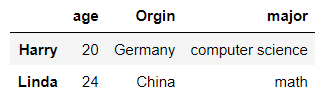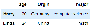 dic2 = {'age': [20,24], 'Orgin': ['Germany', 'China'], 'major':['computer science', 'math']}pd.DataFrame(data = dic2, index = ['Harry', 'Linda'] )