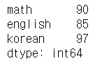 pd.Series(data = {'math': 90, 'english': 85, 'korean': 97})