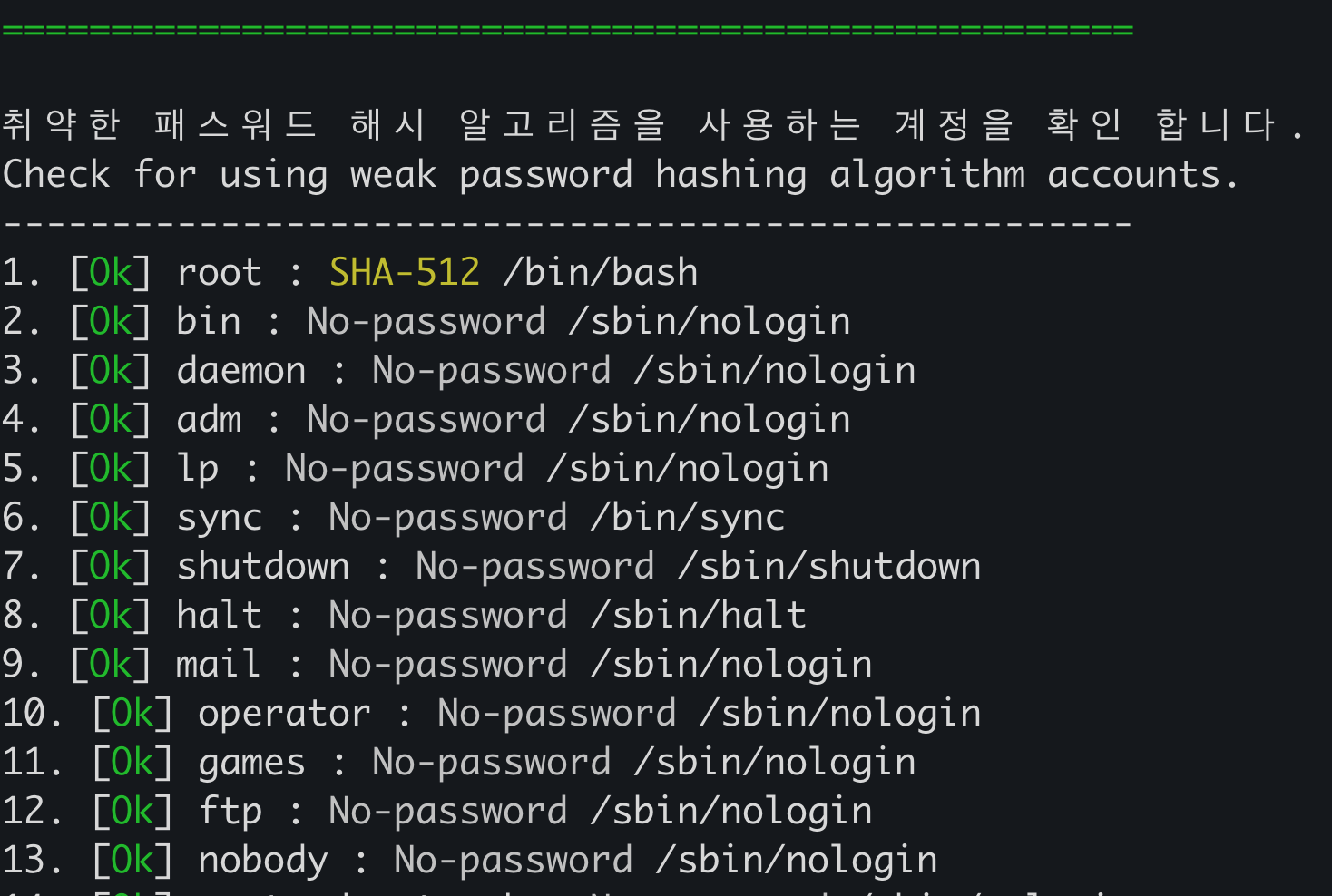 • MD5 로 된 계정은 패스워드를 변경해야 한다. 무엇으로? SHA-512 로 하면 된다.