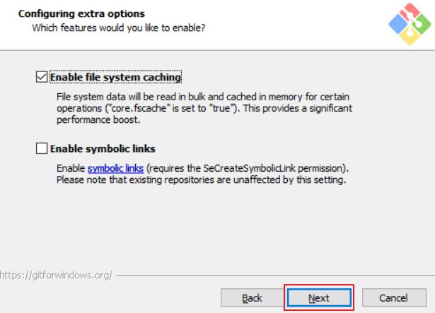 -Enable symbolic links : 심볼릭 링크를 활성화 합니다. (SeCreateSymbolicLink 권한이 필요합니다.) 기존 리포지토리에는 이 설정이 적용 되지 않습니다.