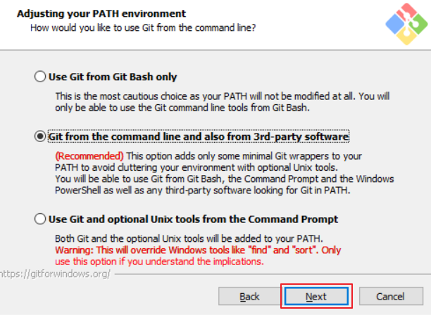 -Use Git and optional Unix from the Command Prompt : Git과 Unix도구 모두 환경변수(PATH)에 추가합니다.