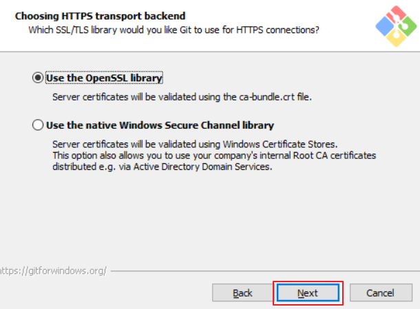 -Use the native Windows Secure Channel library : Windows 인증서 저장소를 사용하여 검증합니다. 이 옵션은 Active Directory 도메인 서비스를 통한 회사 내부 Root CA 인증서를 사용할 수 있습니다.