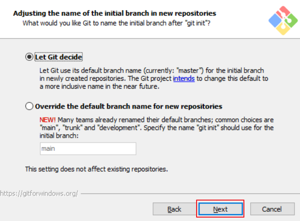 -Let Git decide : 새로운 Repository의 initial branch에 기본 분기 이름(master)을 사용.