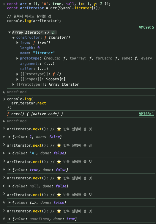 키 Symbol.iterator ( well-known 심볼 ) 의 값으로 이터레이터를 반환하는 메서드를 가짐