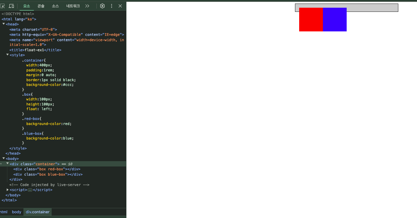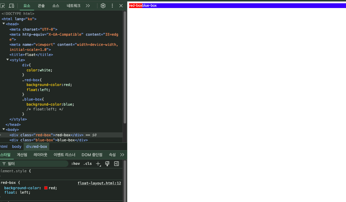 float 속성이 적용 대상을 공중에 띄어 배치하기 때문에 대상이 있던 위치를 빈 공간으로 인식하기에 파란색 요소는 마치 빨간색 요소가 없는 것처럼 인식하고 해당 공간을 파란색 요소의 배경이 차지하는 것.
