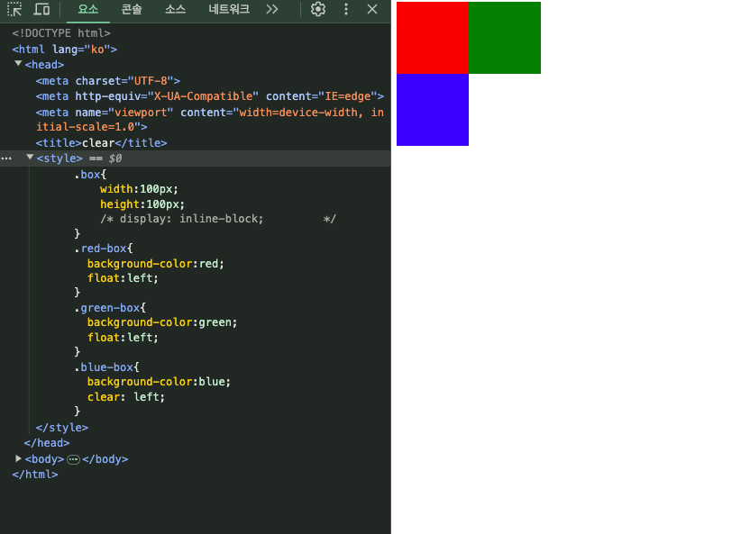 다만 부모 요소가 자식인 빨간색과 파란색 요소의 공간을 제대로 인식하지 못하는 경우가 있다. 즉, float 속성을 적용하면 해당 자식 요소를 부모 요소가 제대로 인식하지 못한다. 이를 해결하기 위해 clear 속성을 사용하거나 overflow 속성을 이용한다.