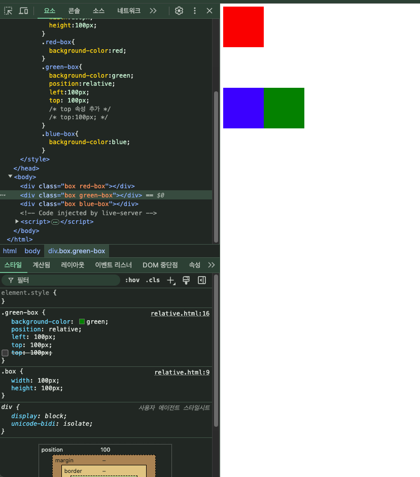 위 예시처럼 left 속성을 100으로 주면 오른쪽으로 밀려나고,top 100을 주면 아래로 밀려난다.