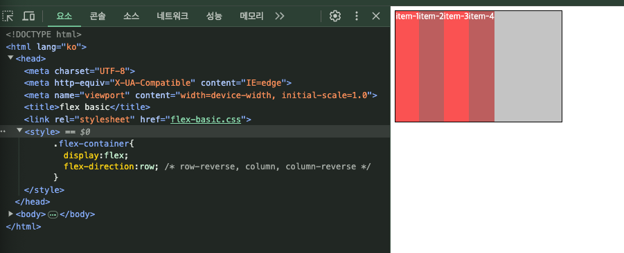 row가 기본 flex-direction 기본 속성 ( 주축 방향을 왼쪽에서 오른쪽으로 지정) row-reverse는 오른쪽에서 왼쪽 지정