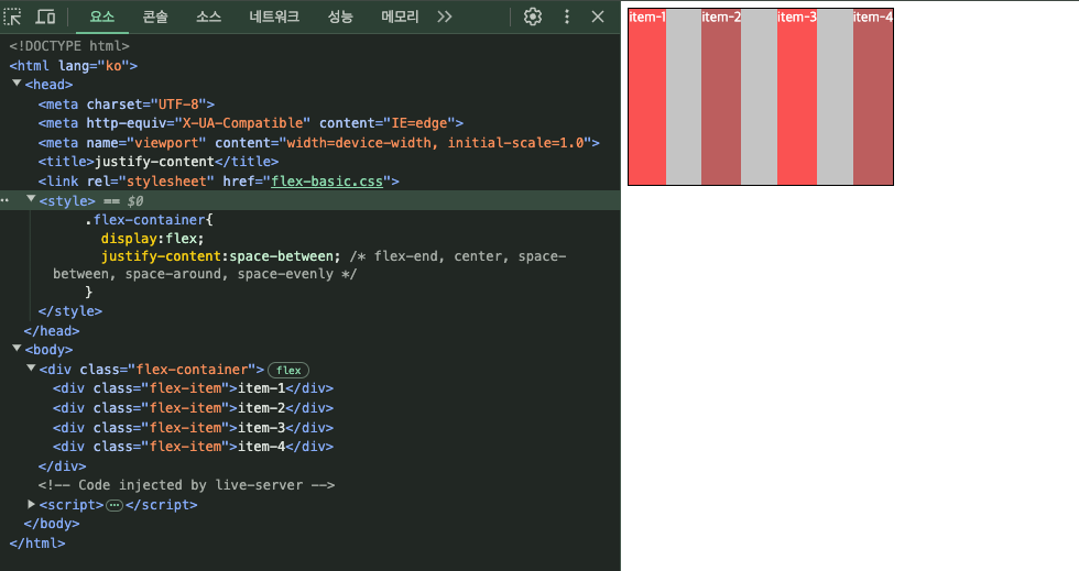 요런 느낌. space-between 속성은 플렉스 아이템 사이의 간격이 균일하도록 정렬