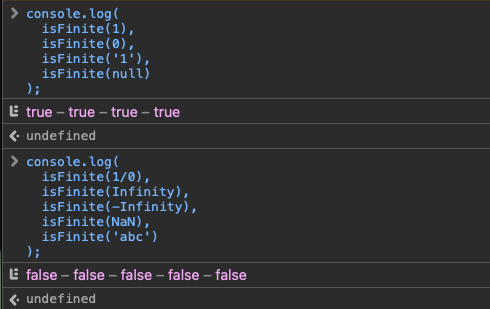 isFinite - 유한수 여부 반환 / 유한수이거나 유한수로 평가될 수 있는 (null은 0) 값 : true / 무한수이거나 수로 평가될 수 없는 값: false