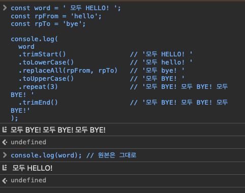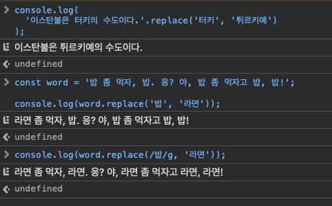 첫 번째 인자로 받은 문자열 또는 정규식을 두 번째 인자로 치환한 결과를 반환