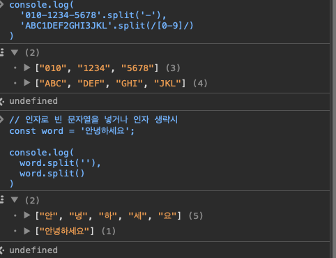 인수로 주어진 문자열이나 정규표현식으로 분리하여 배열을 반환