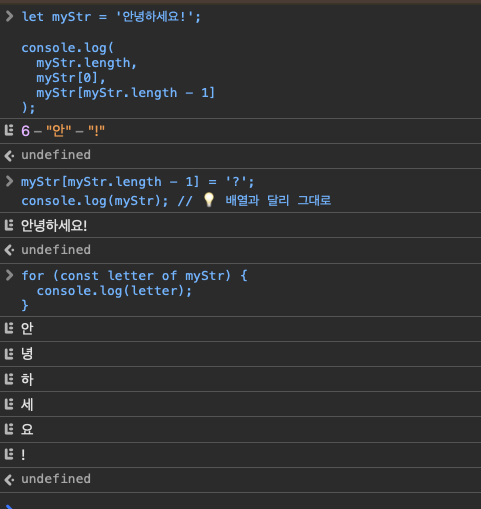 String은 원시값이기에 []접근 또는 인스턴스 메서드로 특정 글자만 수정하는 것은 불가능한 이유는 수정하려면 변수 값 자체를 다른 문자열로 대체해야하기 때문.