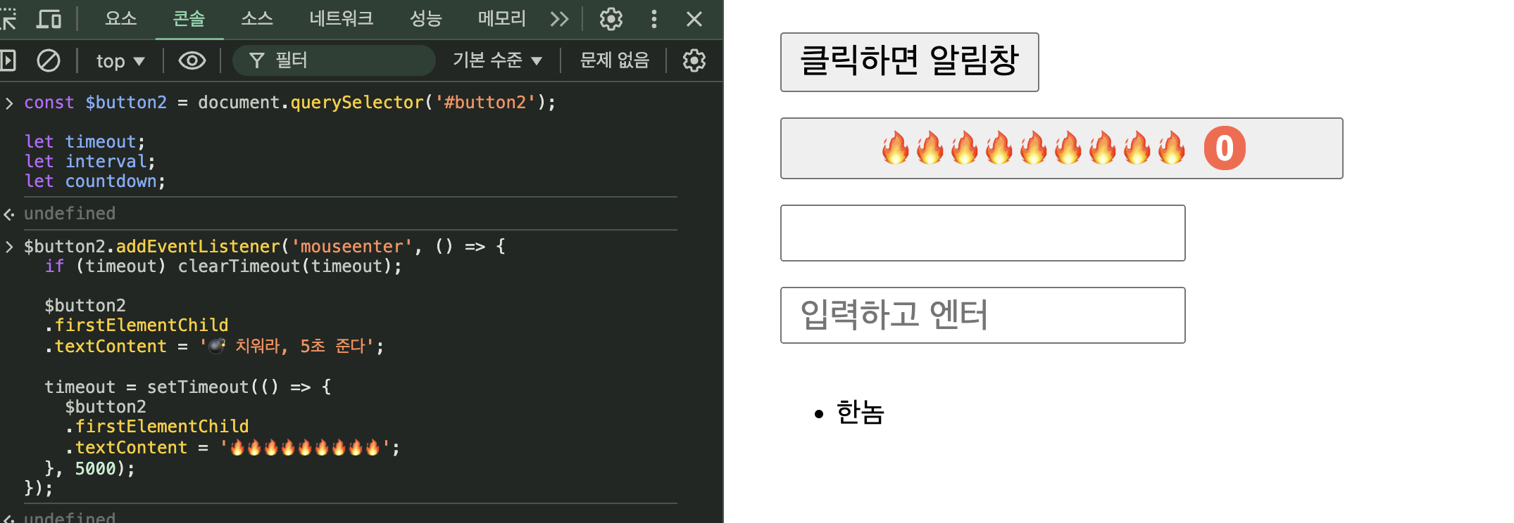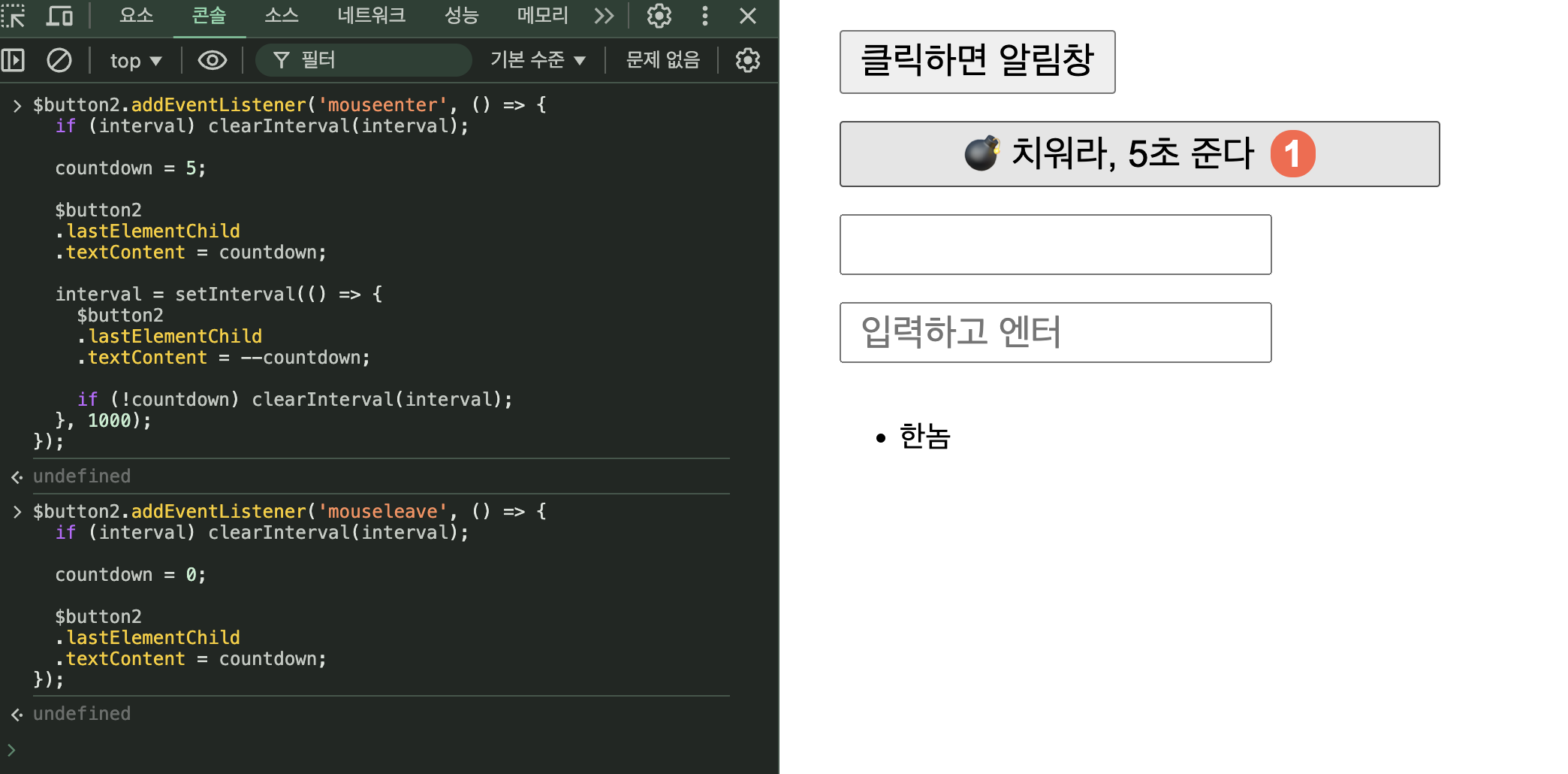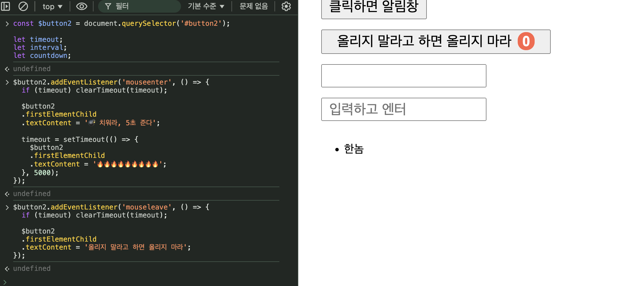 | onemousedown | HTML 요소 위에서 마우스 왼쪽 버튼을 누르는 동안 발생 |
